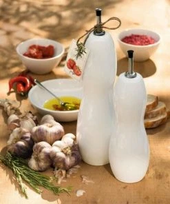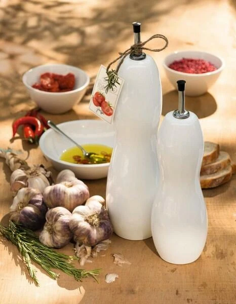 Die geschwungene Essig- bzw. Ölflasche von ASA ist aus hochwertigem Porzellan hergestellt. Mit einem Stopfen lässt sie sich nach der Benutzung wieder leicht verschließen und bietet Platz für die Aufbewahrung aromatischer Öle oder Essig. In Kombination mit einer gleichen Flasche mit unterschiedlicher Höhe entsteht so auf dem Tisch ein Zusammenspiel der Formen.