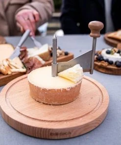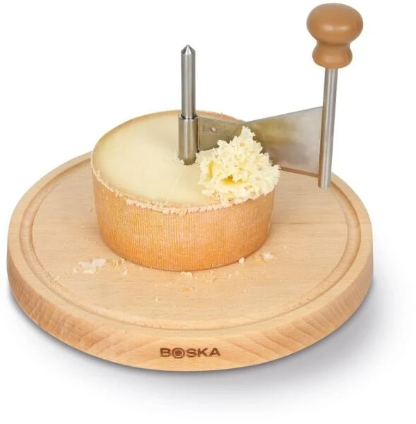 Boska Käseschaber AMIGO mit Buchenbrett. Dieser Schaber formt eine hauchdünne Käselocke, so dass der raffinierte Geschmack des Tête de Moine-Käse überraschend gut zur Geltung kommt.