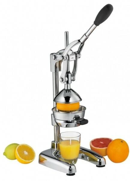 Mit der Profi Saftpresse Amalfi von cilio können Sie im Vergleich zu herkömmlichen Saftpressen bis zu 25% mehr Saft aus Zitrusfrüchten wie Orangen oder Zitronen gewinnen – und das bei wenig Kraftaufwand durch die effektive Hebelwirkung! So bleiben die Kerne und das Fruchtfleisch im Presskegel. Die Saftpresse überzeugt durch stabile Profiqualität. Der Presskegel und Trichter sind aus rostfreiem Edelstahl hergestellt.
