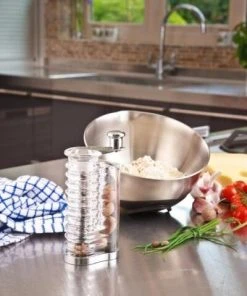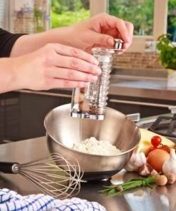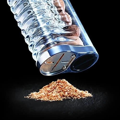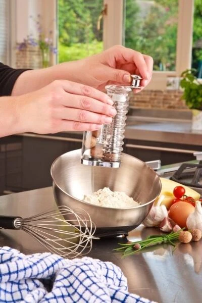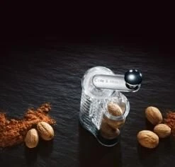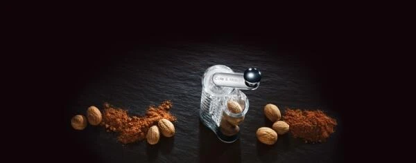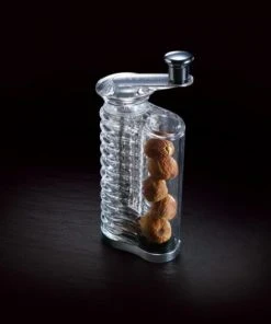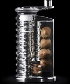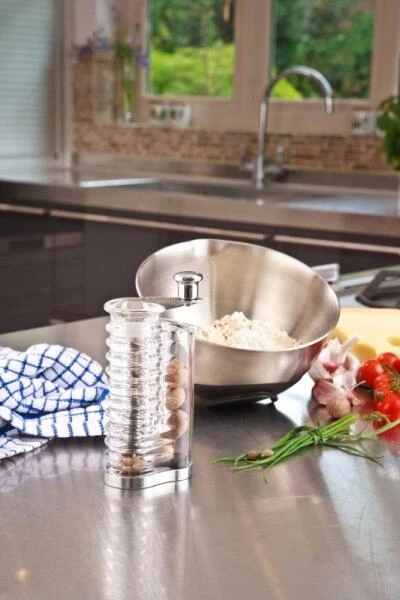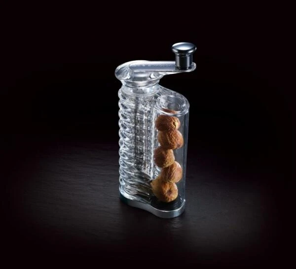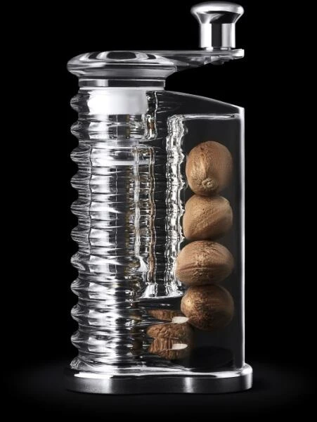 Die Muskatmühle überzeugt durch ihr neues Design aus Acryl und Verchromung. Sie verfügt über eine außergewöhnliche Reibefläche für harte Nüsse. Die Klinge mit Wellenschliff erzielt beste Mahlergebnisse. Zudem fällt dank des einzigartigen ‘Hub- und Ausgabe’-Systems die nächste Muskatnuss an die richtige Stelle. In der Mühle können bis zu 6 Muskatnüsse aufbewahrt werden.