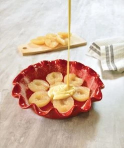 Emile Henry Pie Dish mit Wellenrand in granatapfel. Die ofenfeste Keramik bäckt Ihre Obstkuchen schön gleichmässig durch und hält lange heiss oder kalt.