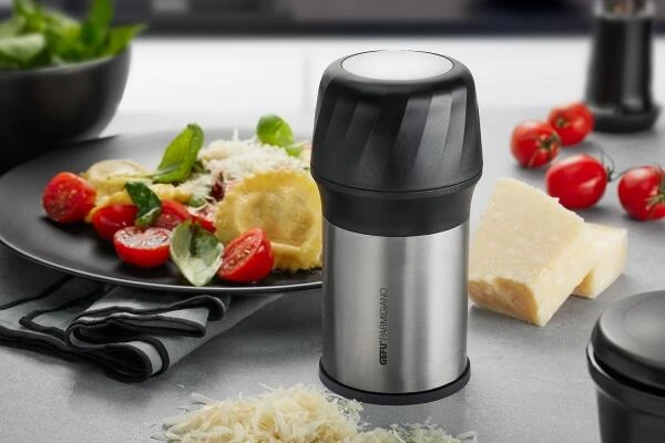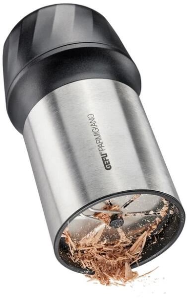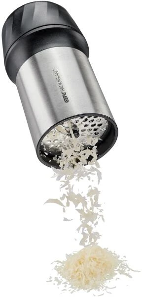 GEFU Fein- und Flockenhobel Parmigianot. Die Reibe ist mit ihren zwei auswechselbaren Laser Cut Reibscheiben multifunktional einsetzbar und zaubert im Handumdrehen sowohl Flocken als auch fein Geriebenes aus Hartkäse, Blockschokolade oder Nüssen.