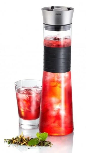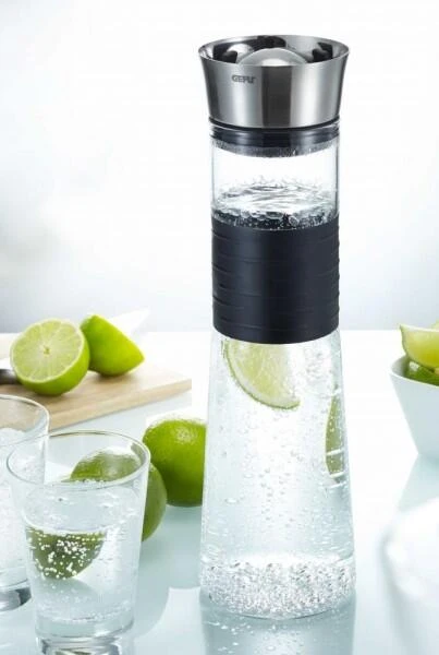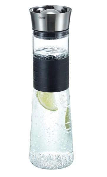 Mit der formschönen, aus hitzebeständigem Borosilikatglas bestehenden Karaffe CASCADA von GEFU lassen sich Getränke durch den innovativen und praktischen Kugelverschluss einfach und schnell einschenken. Da die Edelstahlkugel direkt auf einem Sieb ruht und sich beim Gießvorgang so bewegt, dass in jeder Position perfekt dosiert werden kann, bleiben Kräuter, Eiswürfel & Co. in der Karaffe. Zusätzlich wird der Inhalt auch vor Insekten geschützt. Durch die schlanke Form der Karaffe mit Antirutsch-Silikongriff für ein sicheres Handling, passt sie in jede herkömmliche Kühlschranktür. Der Kugeleinsatz kann komplett auseinander genommen werden und ist dadurch einfach zu reinigen.