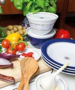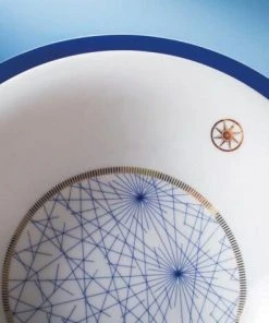 Die zwei eleganten und maritimen Dekore in Dunkelblau und Gold können nach Belieben miteinander oder dem weißen Dekor kombiniert werden. So kann der kleine Snackteller sowohl als Untersetzer als auch als Deckel für die Tassen und Schalen verwendet werden.