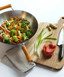 Ein traditioneller chinesischer Wok aus 1,8 mm starkem Karbonstahl, der vor der ersten Nutzung eingebrannt werden sollte. Eine natürliche, effektive Antihaftbeschichtung (Patina) bildet sich im Lauf der Verwendung. Der flache Boden sorgt dafür, dass der Wok gut ausbalanciert ist und nicht umkippt, wenn er auf dem Herd steht. Er ist für alle Herdarten inklusive Induktion geeignet.