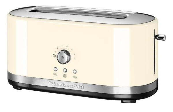 KitchenAid Langschlitztoaster mit manueller Bedienung in creme. Mit langen, extra breiten Schlitzen, 7 Bräunungsstufen, Auftau-, Warmhalte- und Bagel-Funktion. Aus robustem und stabilem Metallgehäuse.