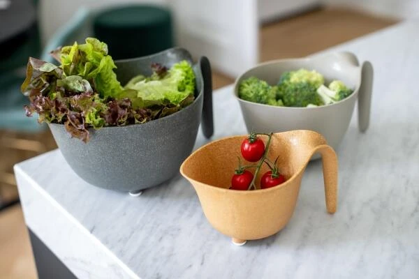 Bei der Reihe “organic bio-circular” von koziol treffen entsorgtes Sonnenblumen- und Rapsöl aus Industrie und Gastronomie recycelt auf Holzfasern, die bei der Forstpflege und der Papierherstellung als Reste anfallen. Alle Hölzer stammen aus FSC®-zertifiziertem Anbau in Europa.