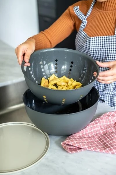 koziol Schüssel PALSBY in grau. Der Seiher aus recyceltem Kunststoff ist made in Germany. In 2 Größen verfügbar.