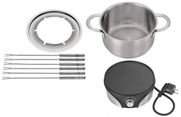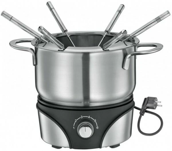 Das standfeste elektrische Rechaud verfügt über eine stufenlose Temperaturregulierung von 50°C bis 210°C und sorgt für ein optimales und schnelles Erhitzen des Inhalts im Edelstahltopf. Dieser Topf lässt sich allerdings auch problemlos auf allen Herdarten inklusive Induktion anwenden, er fasst 1,5 l und garantiert mit dem aufsetzbaren Spritzschutz besondere Sicherheit am Tisch. Darüber hinaus sind noch 6 Fleischfonduegabeln mit jeweils unterschiedlicher Markierung und eine Bedienungsanleitung mit Rezepten im Lieferumfang enthalten.
