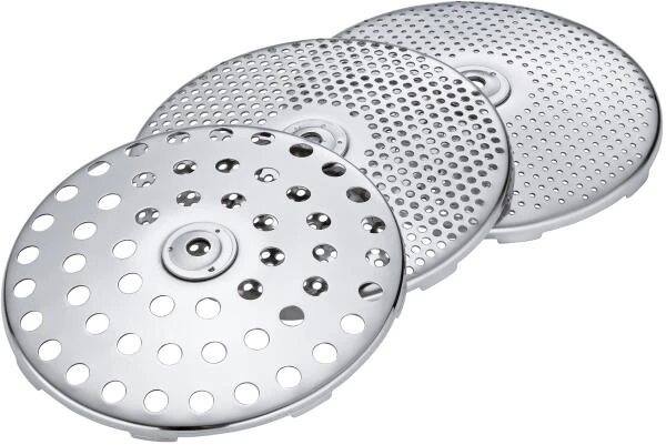 - mit drei unterschiedlichen Scheiben (grob 8 mm, mittel 3 mm, fein 2 mm)