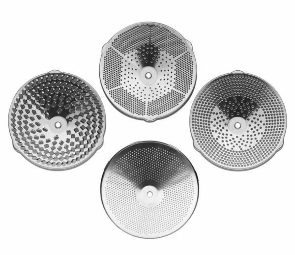 Mit vier Einsätzen, bestehend aus einer groben, mittleren, feinen und extra-feinen Scheibe.