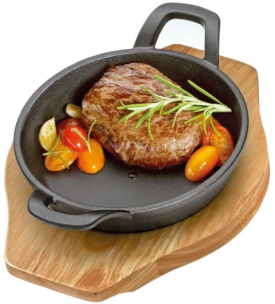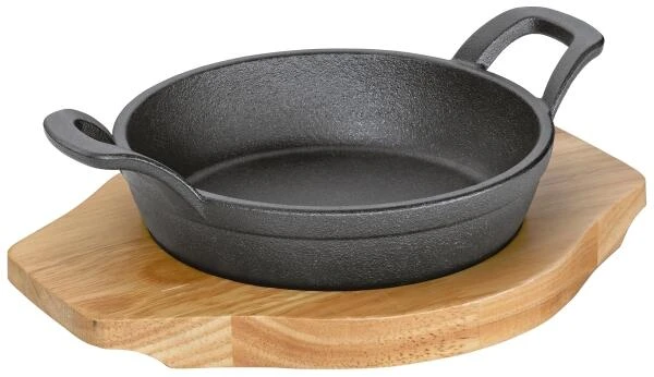 Küchenprofi Servierpfanne mit Holzbrett. Ideale Servierpfanne zum Zubereiten kleiner Speisen und Beilagen auf dem Grill und im Ofen.