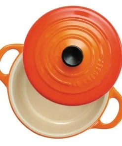 Le Creuset Mini Cocotte in ofenrot mit Deckel. Die Mini-Cocottes sind vielfältig einsetzbar, z.B. als Marmeladentöpfchen, zum Servieren von Snacks oder zum Zubereiten von kleinen Gerichten und Desserts.