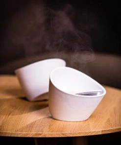 Teetasse LASTU in weiß. Die designprämierte Teetasse mit schrägem Boden und inklusive Teesieb bietet einzigartigen Teegenuss! Und die Tasse ist aus einem Holz-Verbundstoff und hat dadurch eine einzigartige Oberfläche, die nicht zu heiß ist. Kunststoff-frei!