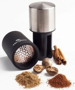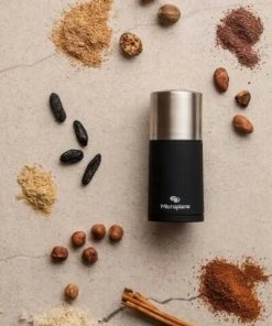Microplane Muskatmühle in edelstahl. Hiermit werden Gewürze wie Muskatnuss, Tonkabohnen und Zimt mühelos gerieben und aufbewahrt.