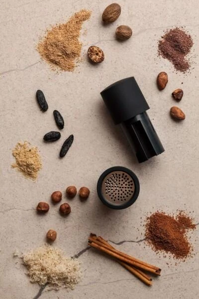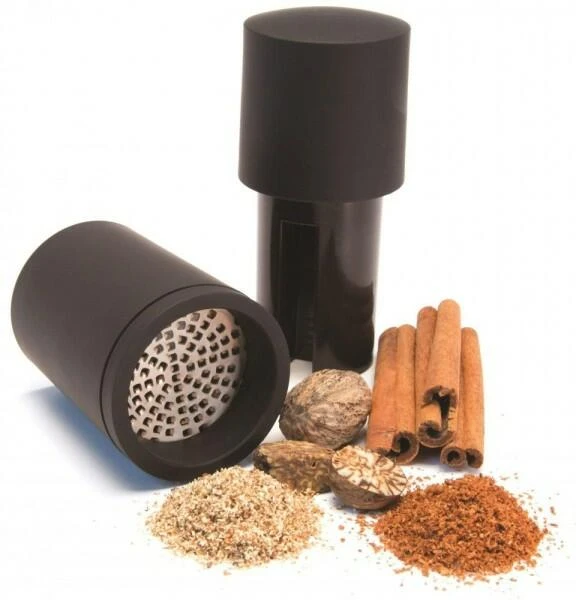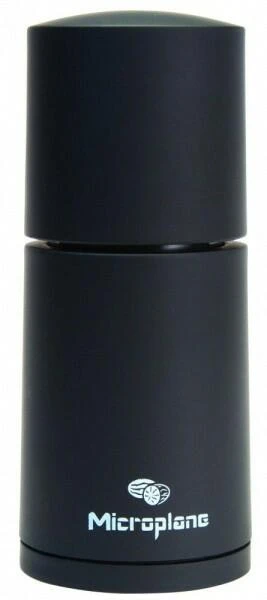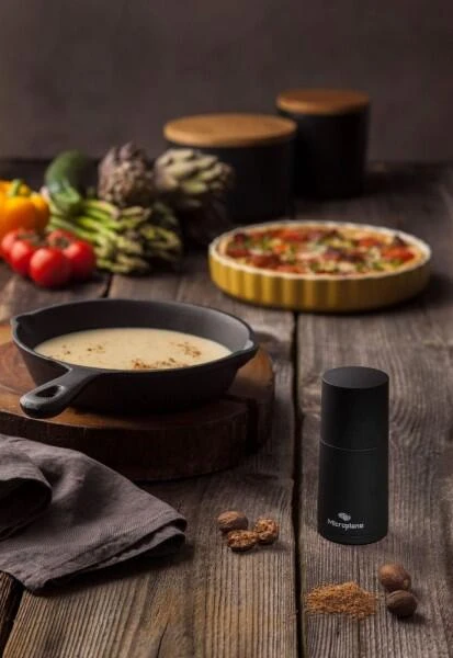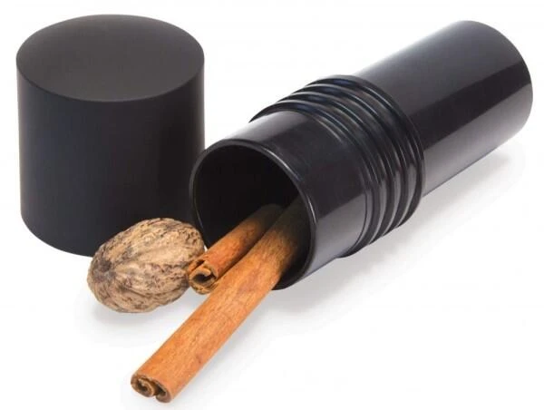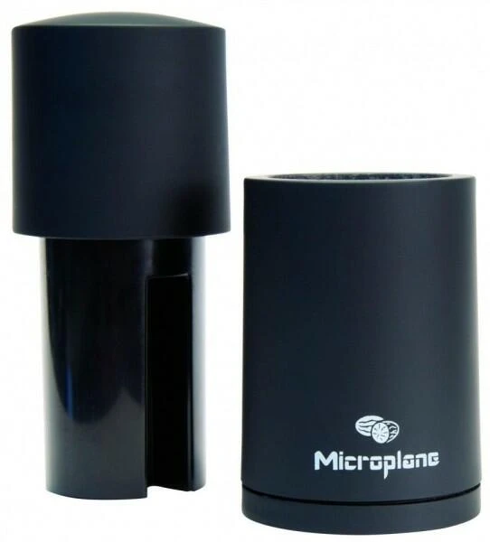 Microplane Muskatmühle in schwarz. Hiermit werden Gewürze wie Muskatnuss, Tonkabohnen und Zimt mühelos gerieben und aufbewahrt.