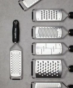 Elegant ausgearbeitet, bietet die leistungsstarke Gourmet Serie von Microplane sieben verschiedene Klingenvarianten an: Grob, Fein, Mittelgroße Schneide, Große Raspel, Extra Grob, Sternenklinge und XL-Grob.