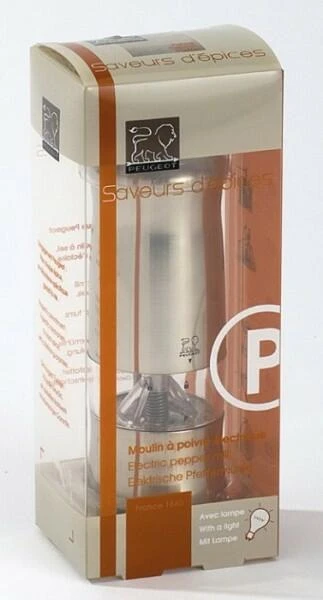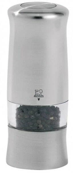Pfeffermühle Zeli elektrisch und mit Beleuchtung, ABS vernickelt und gebürstet. Mahlen mit hohem Komfort und der gewohnten Schärfe eines PEUGEOT Mahlwerks. Mit den elektrischen Mühlen von PEUGEOT läßt sich das Mahlgut optimal dosieren.