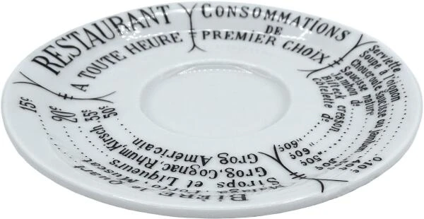Pillivuyt Dekor Brasserie ist mit einer Speisekarte eines Pariser Bistros bedruckt. Damals konnte jedes Bistro, jede Brasserie und jedes Restaurant seine Speisekarte in das eigene Geschirr einbrennen lassen. Heute befindet sich auf dem