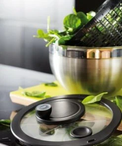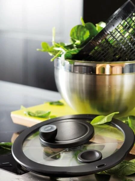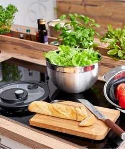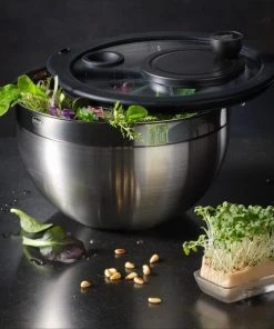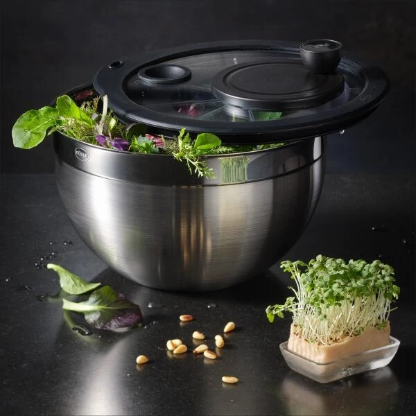 Die Rösle Salatschleuder besteht aus der original RÖSLE Schüssel inklusive Deckel aus bruchfestem Glas, Korbeinsatz und Drehteller. Der Schleuderantrieb ist etwas seitlich auf dem Deckel platziert, so dass man die Schüssel bequem mit einer Hand festhalten kann. Beide lassen sich einfach und ohne großen Kraftaufwand bedienen. Die Edelstahlschüssel kann auch einzeln als Rührschüssel oder zum Servieren benutzt werden und ist wie alle anderen Teile spülmaschinengeeignet.