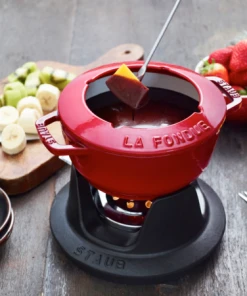 Staub Fondueset aus Gusseisen kirschrot. Fonduetöpfe aus Gusseisen speichern Hitze ideal und halten das Fett oder die Brühe besonders lange heiß – bei Tisch, wenn Sie mit Freunden das Fondue zelebrieren.