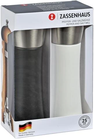 Zassenhaus Mühlen-Set Augsburg schwarz/weiß. Zum Set gehören die weiße Salz- und die schwarze Pfeffermühle der Serie Augsburg.